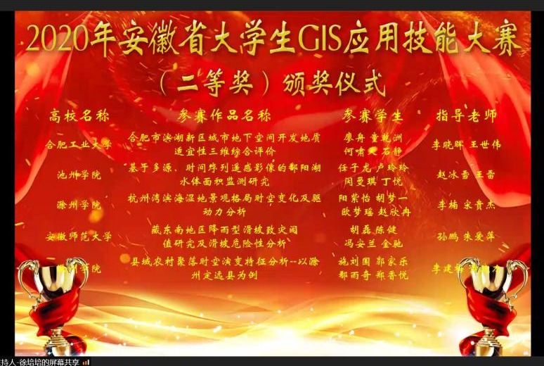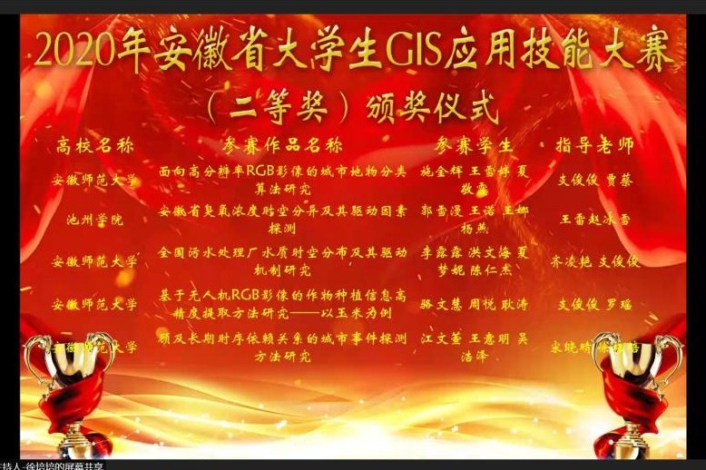 由安徽省教育厅主办,安徽师范大学承办的2020年安徽省大学生GIS应用技能大赛于11月8日完成决赛。比赛经过9月初的报名,10月20日的作品提交,10月31日的决赛名单公布到11月8日的线上答辩,历时两个多月的时间。受疫情的影响,今年比赛仅有“论文展示组”。
