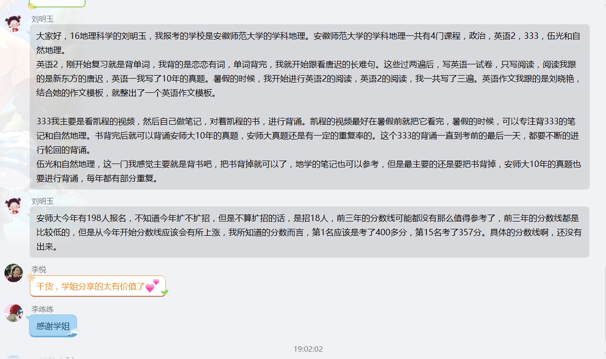 5月7日晚,班级通过QQ线上平台组织了一次“云”端学习经验分享交流会,邀请了往届的学长学姐来分享他们的成功经验。他们有的考上了研究生,有的考上了教师编制,有的考上了公务员……交流会还通过文字形式进行经验分享,学长和学姐们毫无保留的提供他们收集到的各类资料图片和网站,同学们的提问热情积极,学长学姐们的解答耐心详细,他们将自己的所知倾囊相授。交流会持续了3个小时,同学们受益匪浅、意犹未尽。