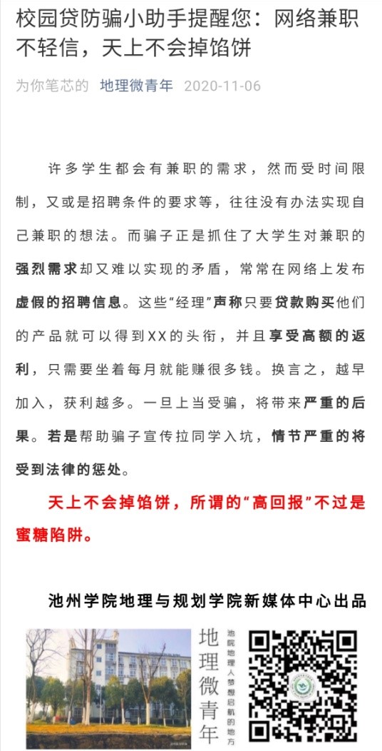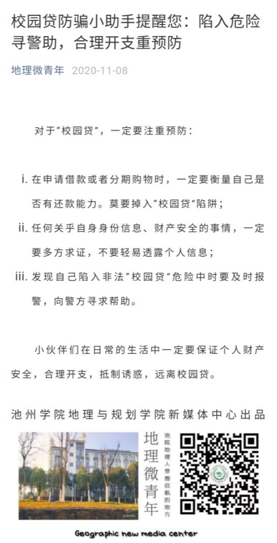 此次活动通过“地理微青年”微信公众号,以微信推文的形式进行宣传。活动期间开辟“校园贷防骗小助手”专栏,从阐述校园贷的危害、举例校园贷常见套路,以及妥善保管个人信息等方面对校园贷和如何避免落入校园贷的圈套进行讲解,提醒广大同学要保障个人财产安全,合理开支,抵制诱惑,远离校园贷,营造“理性科学消费,拒绝校园贷”的浓厚氛围。