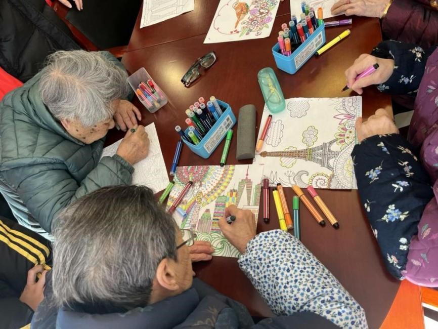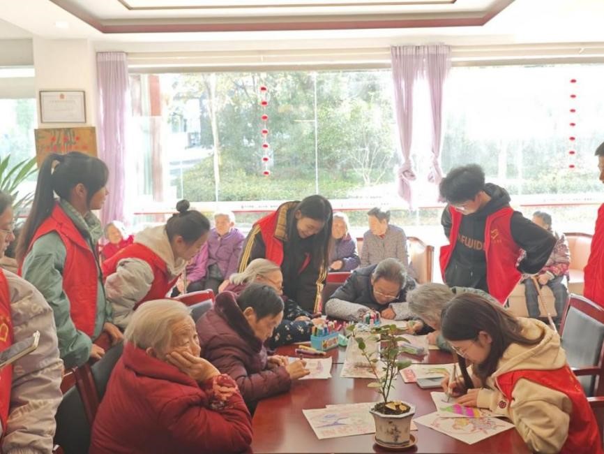 志愿者们以陪伴老人绘画的形式展开活动。他们耐心帮助老人展开画纸,提出色彩填充的建议,每一笔每一划都饱含着独特理解,老人们亲切地称呼他们为“小老师”。在互动环节,志愿者们与老人分享各自的生活趣事,场面温馨感人。活动现场充满了欢声笑语,老人们脸上洋溢着幸福的笑容。
