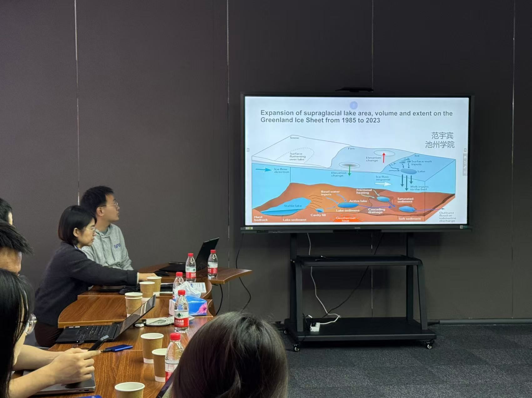 本次会议共设15个专题汇报分会场,涉及雷达测绘与地质灾害、时空大数据分析、极地环境遥感、大湾区城市遥感等话题。共计100多位学者和研究生交流各领域的研究成果,共同探讨研究的问题。范宇宾在极地环境遥感分论坛作了题为《1985至2023年格陵兰冰盖上冰面湖的面积、体积和范围在增加》的报告。