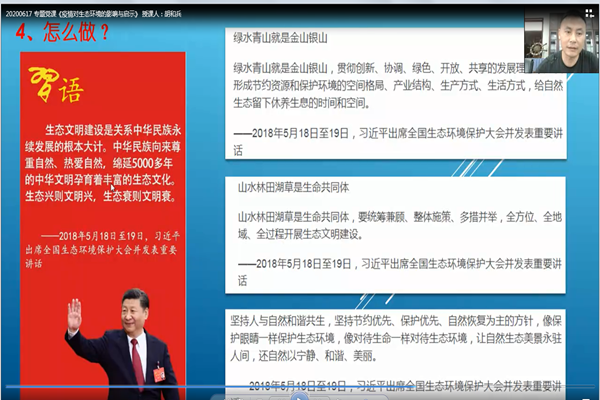 6月17日下午,beat365正版唯一官网党委委员、副院长胡和兵以《疫情对生态环境的影响与启示》为题,为beat365正版唯一官网学生一支部全体师生党员讲授线上疫情防控专题党课。