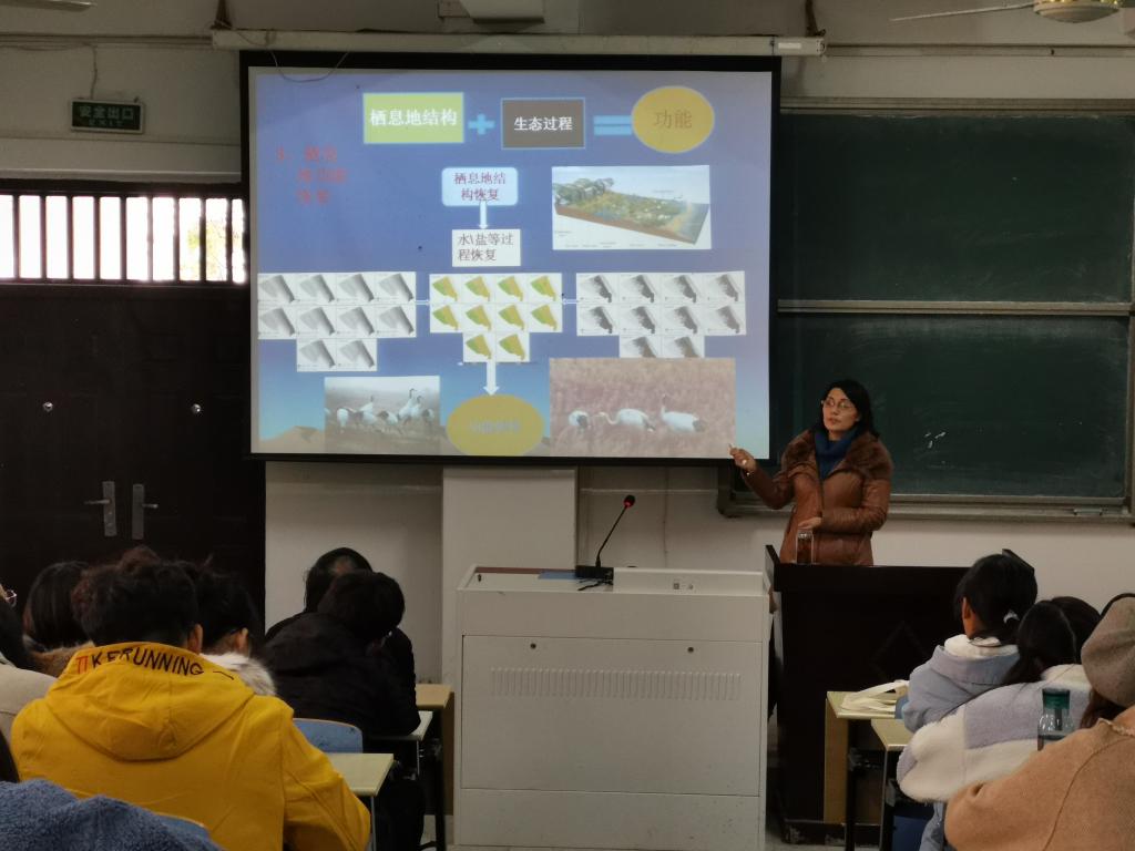 刘红玉教授以丹顶鹤为例,用风趣简洁的语言,深入细致地阐述了丹顶鹤现状分布、生物学及文化特征,分析了丹顶鹤面临威胁及其保护意义,全面阐释了栖息地恢复结构模式的全新理念。报告让beat365师生耳目一新、受益匪浅。师生互动环节,同学们积极向刘教授请教和提问,刘教授进行了耐心的回答和讲解。