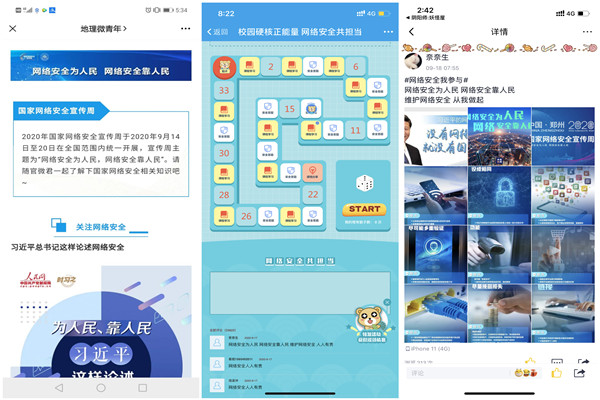 组织师生党员线上发声。当前,信息化发展时代潮流与世界百年未有之大变局和中华民族伟大复兴战略全局发生历史性交汇,维护国家网络安全的重要性和紧迫性愈加凸显。学院师生党员纷纷以发朋友圈等形式助力国家网络宣传周的宣传,增强安全意识,提高安全素养。