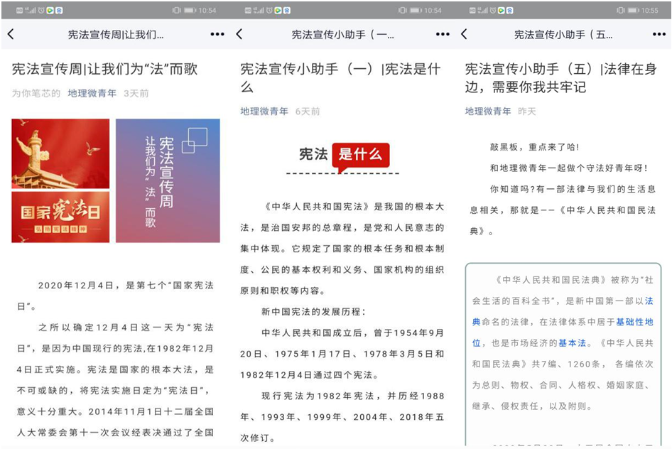 除了组织线下学习,学院还通过微博、微信等新媒体平台积极开展线上宪法宣传学习,普及宣传宪法知识。12月4日,学院“地理微青年”微信公众号推送了名为《让我们为“法”而歌》的博文,宣传第七个“国家宪法日”。宪法宣传周期间,微信公众号推出了宪法宣传小助手系列栏目,此系列一共五期,分别介绍了“宪法是什么”、“宪法规定,国家尊重和保障人权”、“关于宪法,习总书记的这些讲话掷地有声”、“宪法怎样影响你的一生?”、“法律在身边,你我共牢记”等内容。
