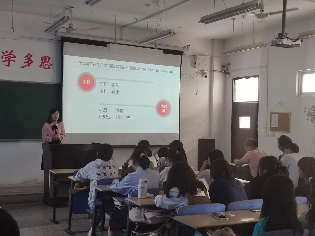 其次,专业教师贾丽就考研与学生进行了深入的交流,结合历届专业学生考研经历向在座的同学们就院校选择、专业课与公共课的复习备考、调剂及复试等方面分享了宝贵的经验与技巧,使同学们对考研过程有了更具体、更清晰的认识,为今后的考研打下了坚实的基础。