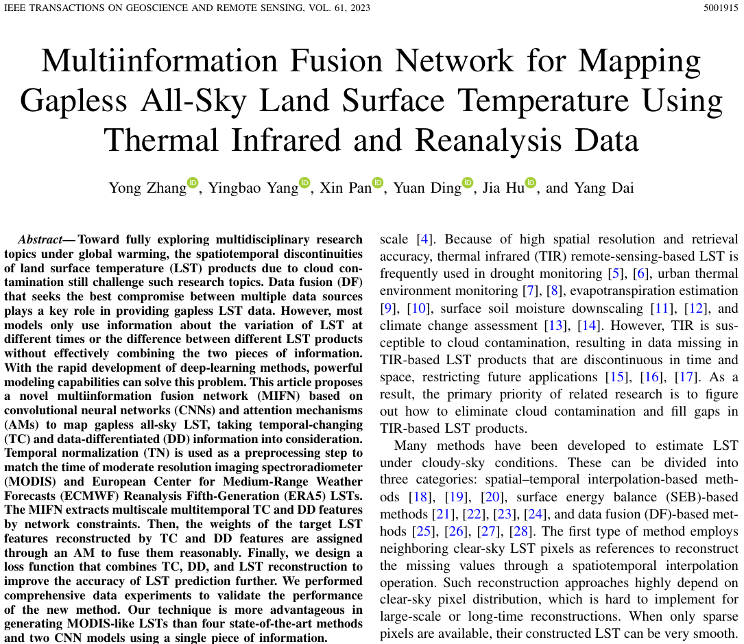 近日,beat365正版唯一官网青年教师章勇以第一作者在地球科学与遥感领域国际顶级刊物《IEEE Transactions on Geoscience and Remote Sensing》(中科院SCI一区Top期刊,影响因子:8.125)发表论文“Multiinformation Fusion Network for Mapping Gapless All-Sky Land Surface Temperature Using Thermal Infrared and Reanalysis Data”(DOI:10.1109/TGRS.2023.3269622)。