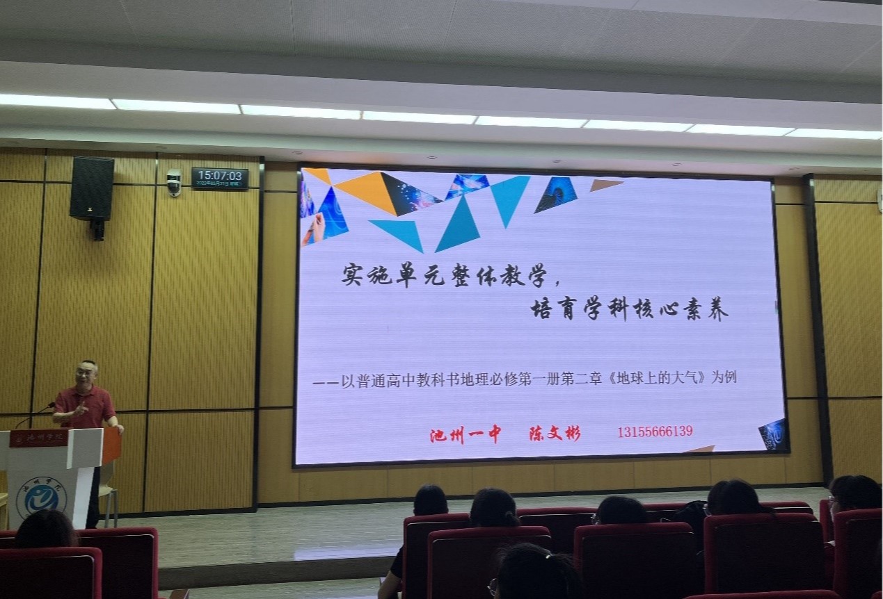 陈文彬老师以“实施单元整体教学,培育学科核心素养”为主题,以普通高中教科书地理必修一第一册第二章《地球上的大气》为例,向同学们讲述了如何上好一堂地理课,并从教材编排、重点内容探讨、教学目标、学情分析几个方面深入剖析了上好一堂地理课的关键。