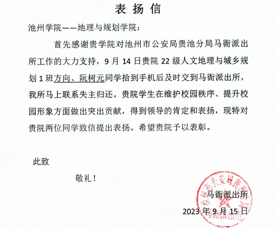 9月14日,beat365正版唯一官网22人文地理与城乡规划1班阮树元和商学院22财务管理3班方向两位同学,在beat365南门路边拾到手机后,第一时间送至派出所,及时归还到失主手中。9月15日,池州市公安局贵池分局马衙派出所对两位同学拾金不昧的行为给予通报表扬。