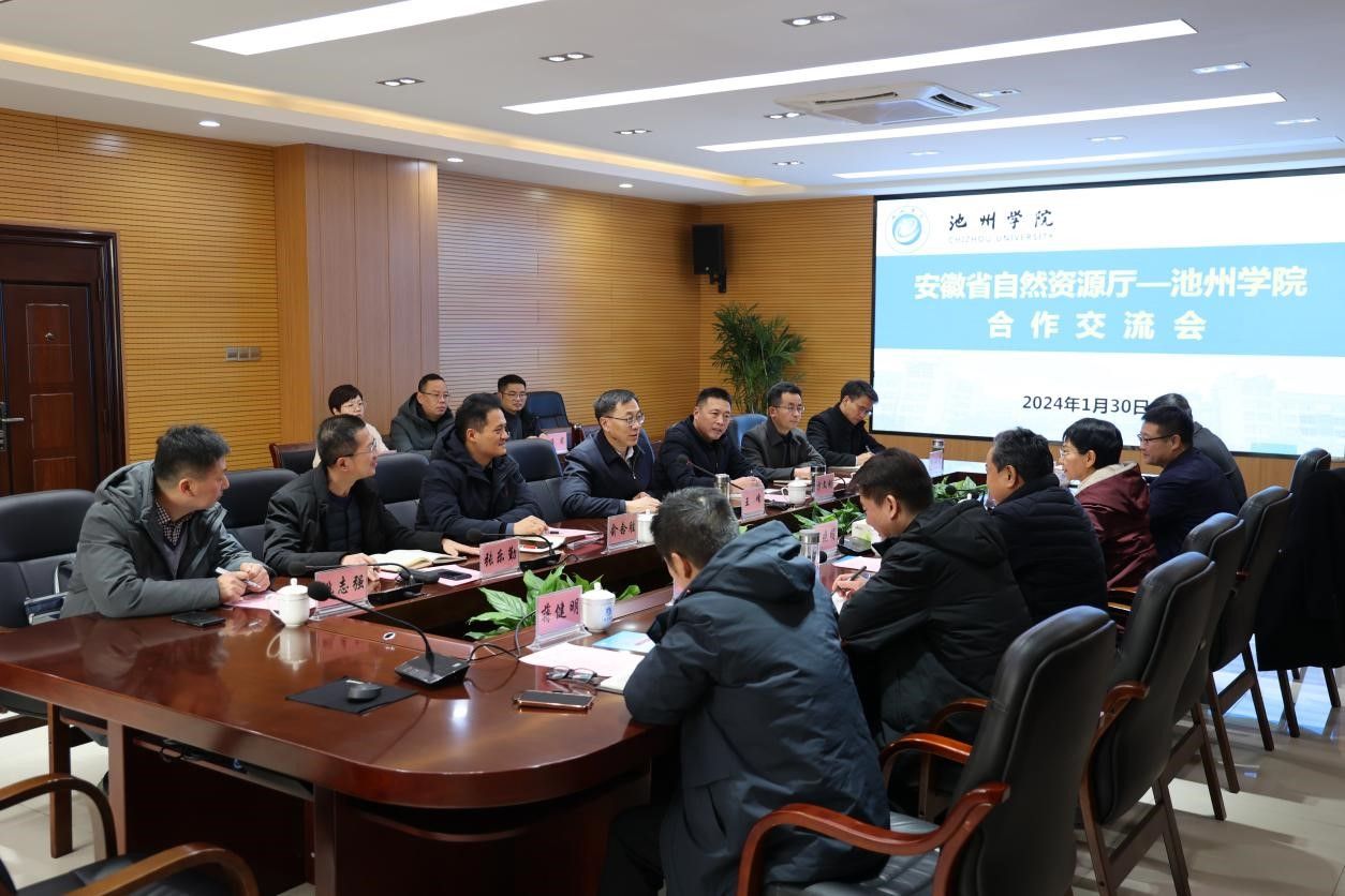 1月30日,安徽省自然资源厅科技外事处处长姚敏一行6人来beat365调研交流。beat365正版唯一官网党委书记王峰主持会议。校办公室、校科研处、beat365正版唯一官网班子成员及教研室主任、骨干教师出席了会议。
