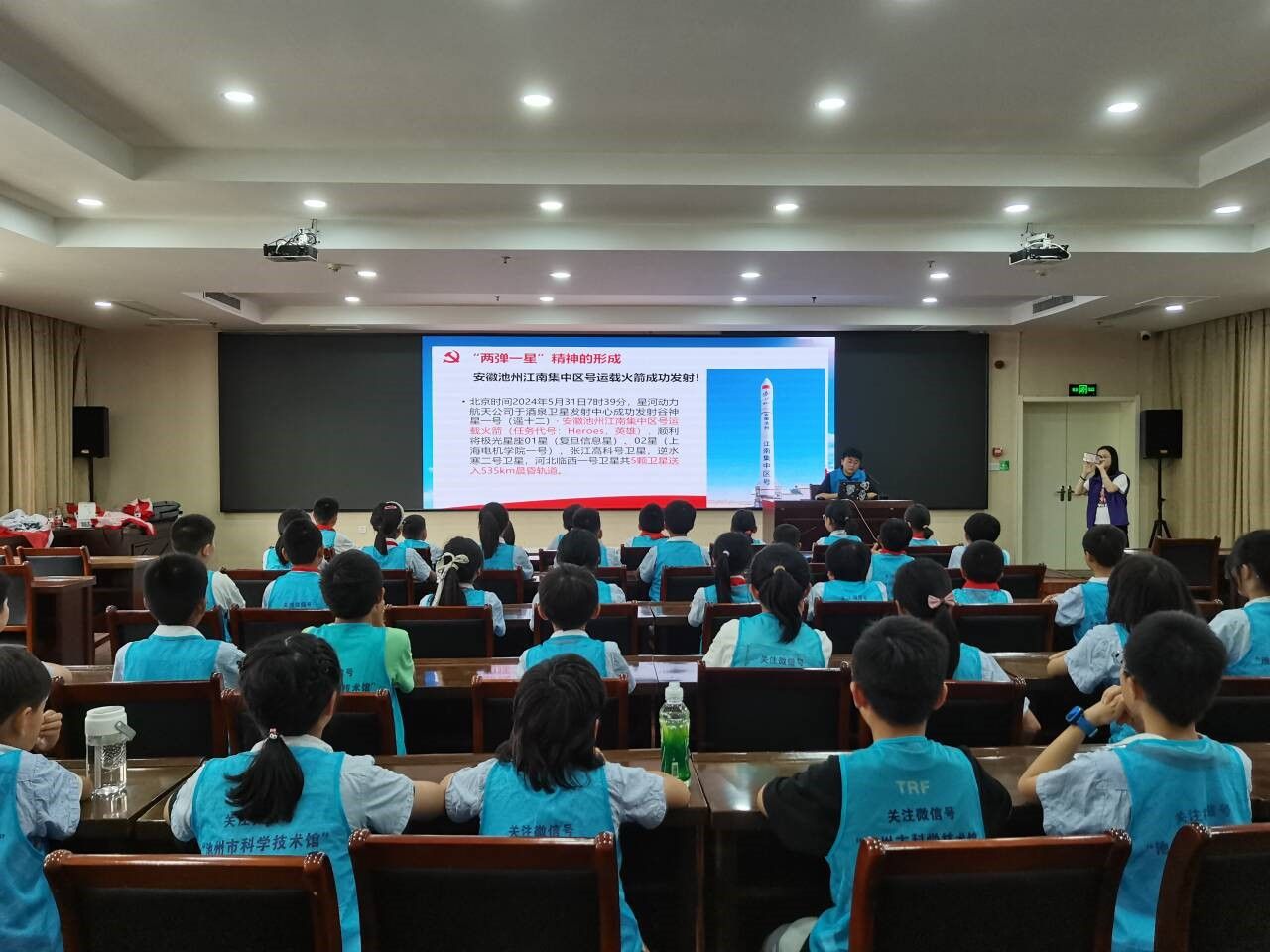 志愿服务队重点从我国第一个导弹火箭研究机构、第一枚国产近程导弹、第一颗原子弹、氢弹、第一颗人造地球卫星等的诞生历史以及5月31日安徽池州江南集中区号运载火箭成功发射的鲜活实例向小朋友们科普了“两弹一星”精神的形成、内涵以及价值。随后志愿服务队带领小朋友们亲手制作航模,现场气氛轻松活跃。