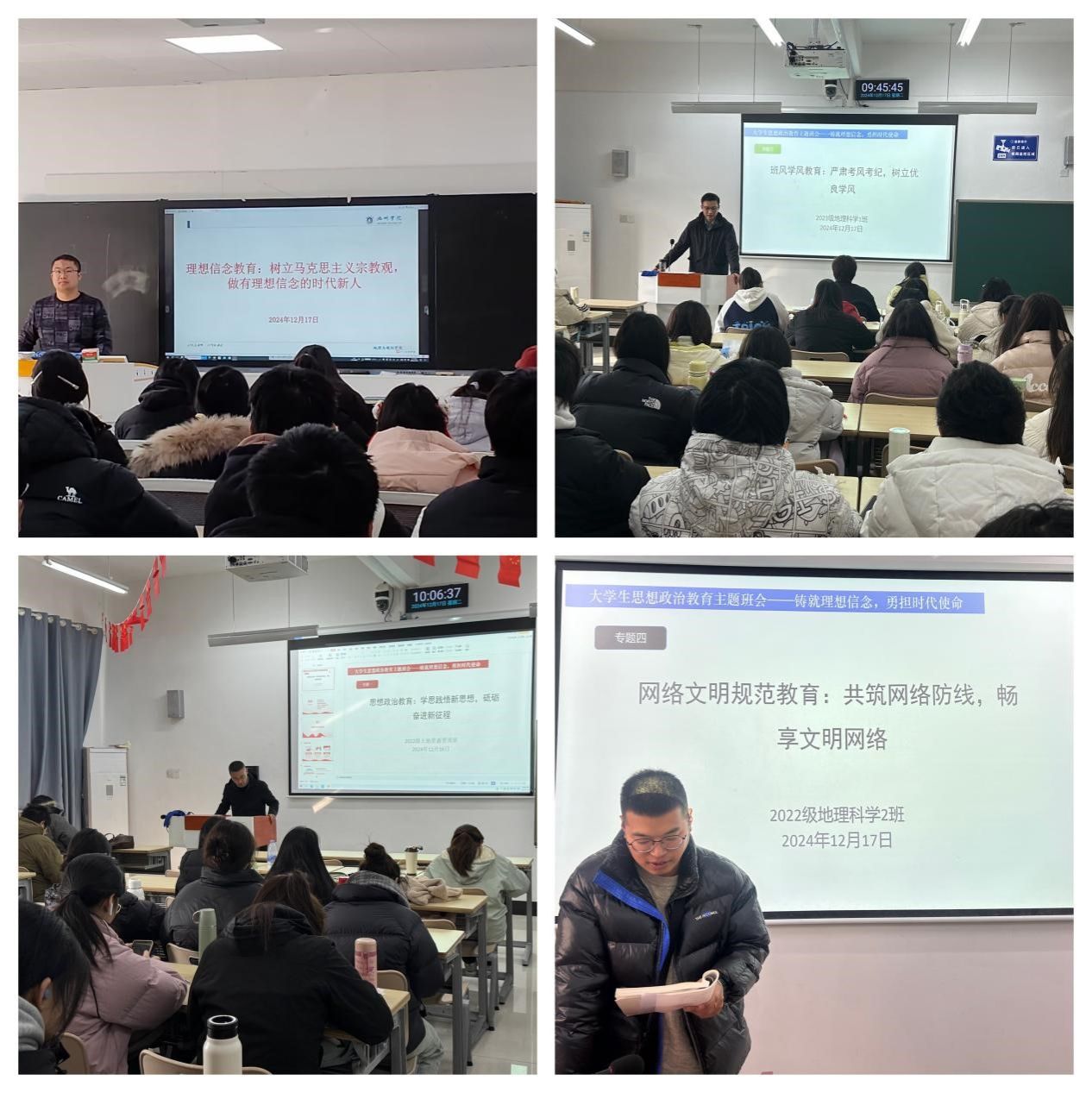 此次主题班会围绕四个核心专题展开:一是“学思践悟新思想,砥砺奋进新征程”,旨在引导学生深入学习新时代思想,并将其转化为实际行动,为新时代的发展贡献力量;二是“树立马克思主义宗教观,做有理想信念的时代新人”,帮助学生认清宗教的本质,树立正确的宗教观念,坚定理想信念,成为有理想、有道德、有文化、有纪律的新时代青年;三是“严肃考风考纪,树立优良学风”,强调考试纪律的重要性,提升学生的诚信意识,为营造公平、公正、优良的学风环境奠定基础;四是“共筑网络防线,畅享文明网络”,加强学生的网络安全意识教育,引导学生文明上网,共同维护网络空间的和谐与安全。