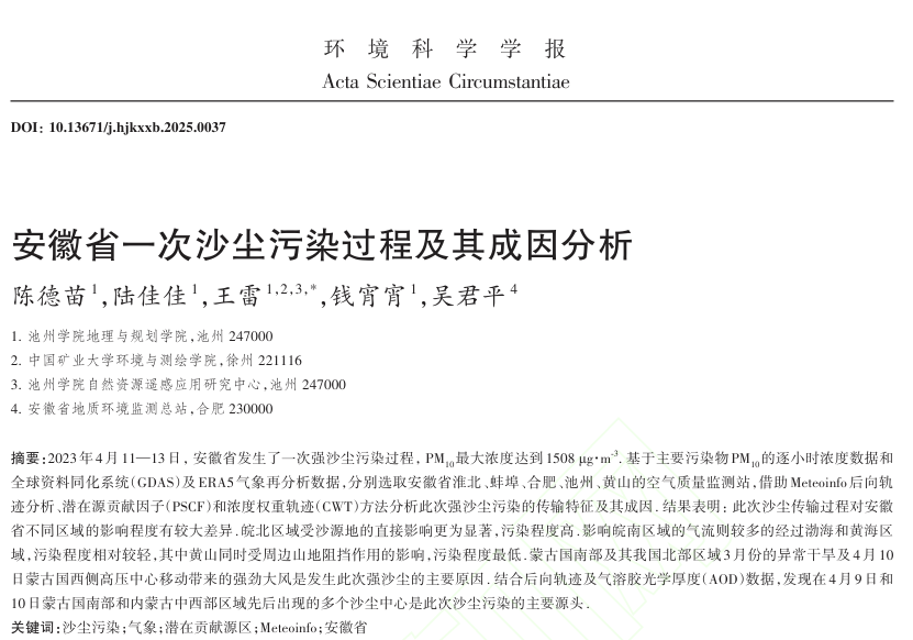 论文针对2023年4月11日至13日安徽省的一次强沙尘污染过程,借助后向轨迹模型及气溶胶光学厚度(AOD)等数据,分析了此次强沙尘污染的传输特征及其成因。研究成果不仅阐释了特殊沙尘污染对安徽大气环境的影响机制,也为探究我国近年沙尘污染频发的问题提供了参考。