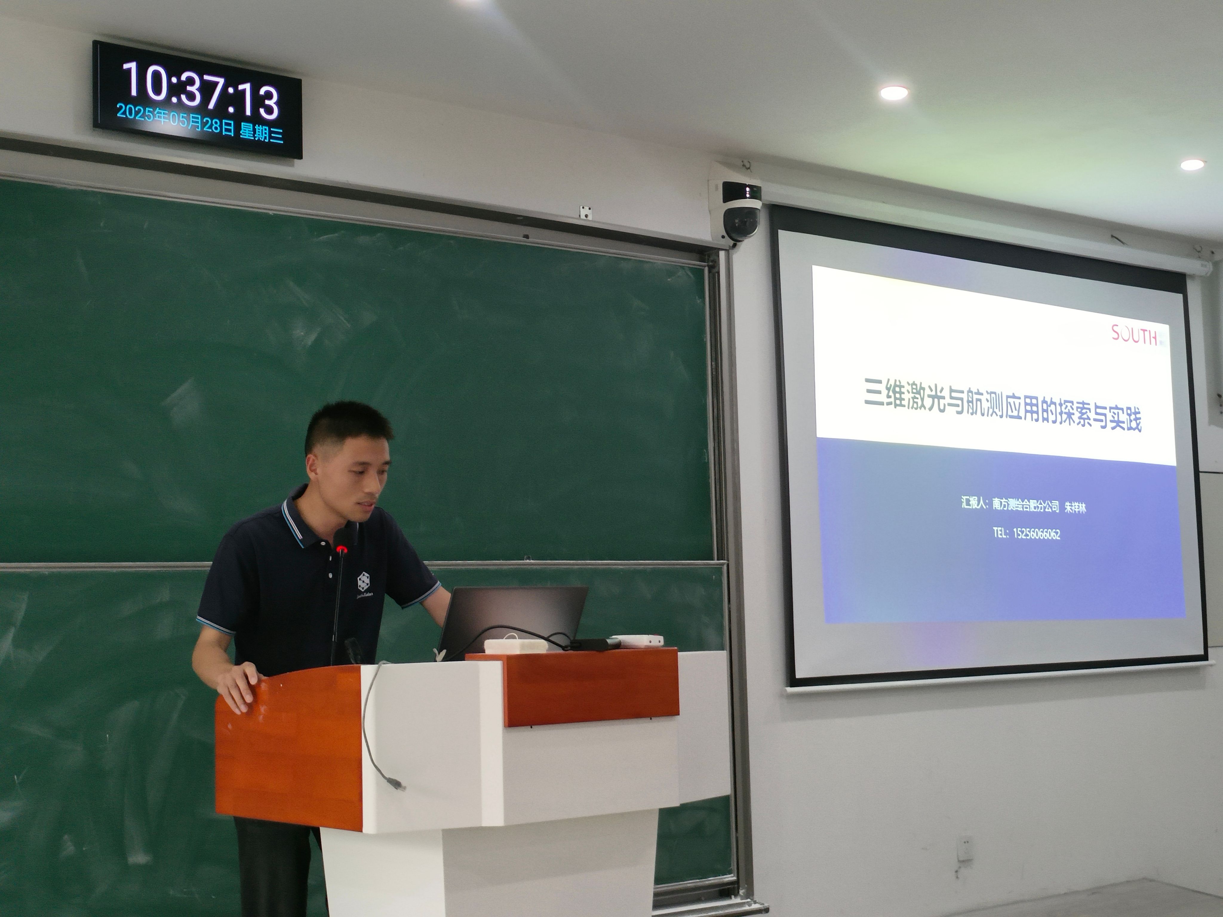 在讲座中,朱祥林首先对常见的无人机产品进行了详细介绍。他不仅讲解了不同无人机的性能特点、技术参数,还分析了各自的优势与适用场景,让同学们对无人机在测绘领域的应用有了更为直观的认识。随后,基于自身丰富的行业生产与管理经验,朱祥林重点介绍了当前三维激光雷达和航测数据的采集及处理流程,并结合应用案例介绍了行业生产实践的主流模式和发展方向。